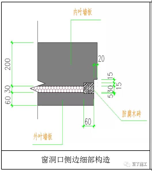 在窗洞上下口和側(cè)部都設(shè)置企口、防腐木,防腐木尺寸為100X60X50mm,內(nèi)穿錨筋一端錨固入內(nèi)葉墻一端錨固入外葉墻,50mm厚的防腐木入外葉墻15mm,入內(nèi)葉墻5mm。